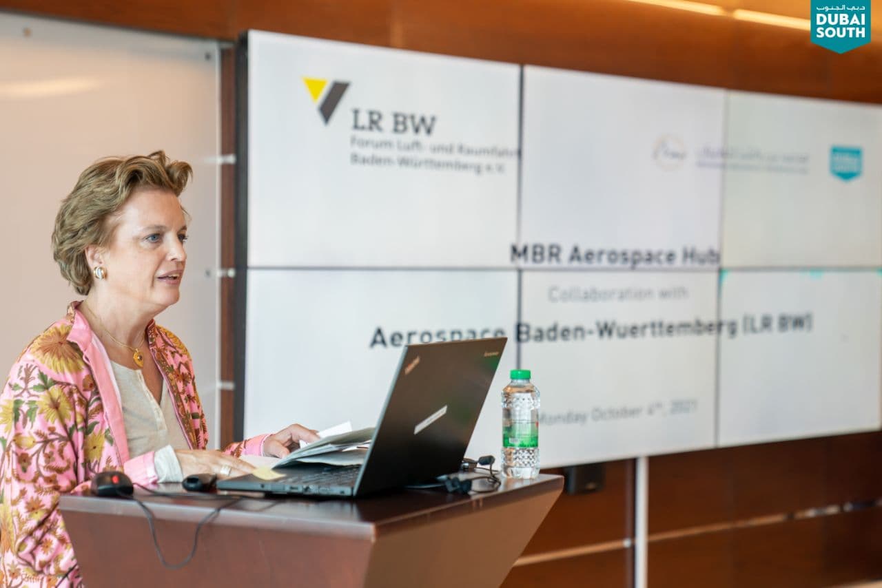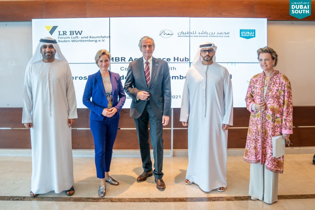 Photo (5) from left: H. E. Saif Tahnoon, (CEO Mohammed Bin Rashid Aerospace Hub), Dr. Nicole Hoffmeister Kraut (Minister for Economy, Labor and Tourism Baden- Württemberg), Prof. Rolf Jürgen Ahlers (President LR BW), Mohammed Ahmed Al Falasi (Director MBRAH), Dr. Beatrice Bischof (German Representative MBRAH)