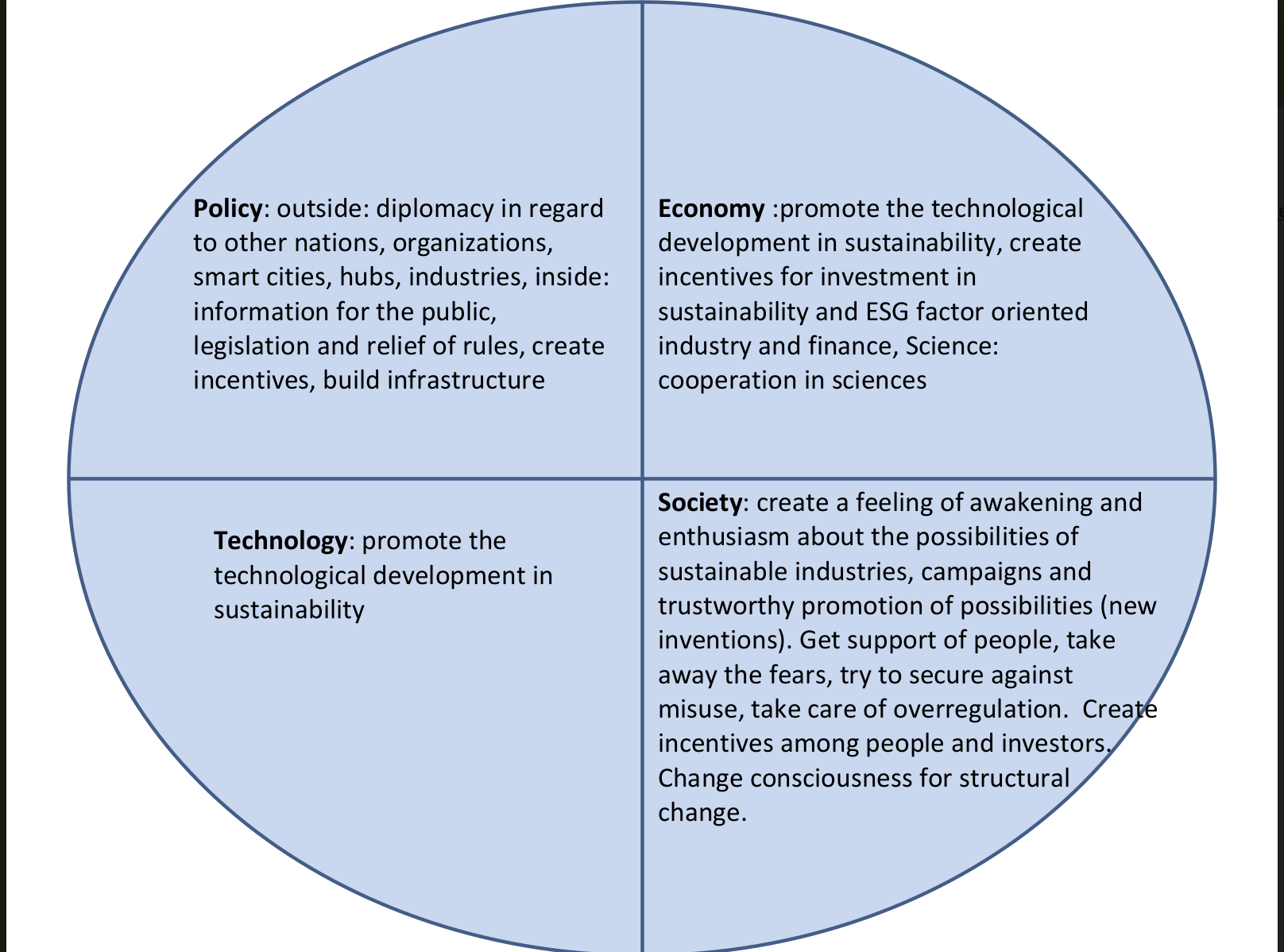 (support, rules), technology: science institutes, inventors, and international science cooperations, society: Create incentives (people and investors), change consciousness for structural change.